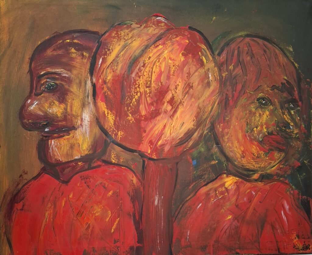 The colours are fiery, representing the fever of coronavirus. The composition is of two individuals facing away from each other as if to maintain social distancing. The shape in the middle is undefined but may be thought of as an unknowable and unspeakable thing, an awareness of the hugeness and awfulness of the virus on the psyche of those who happen to be alive during the pandemic.